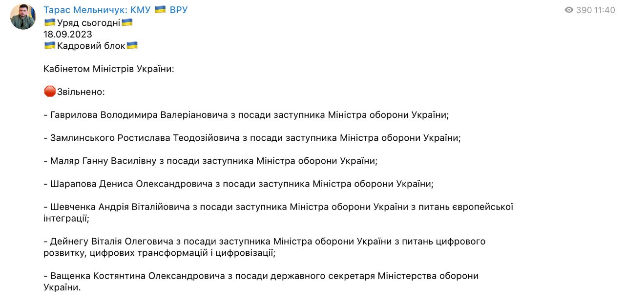 12:00 Кабмін звільнив усіх заступників міністра оборони, повідомив представник уряду в Раді Тарас Мельничук.