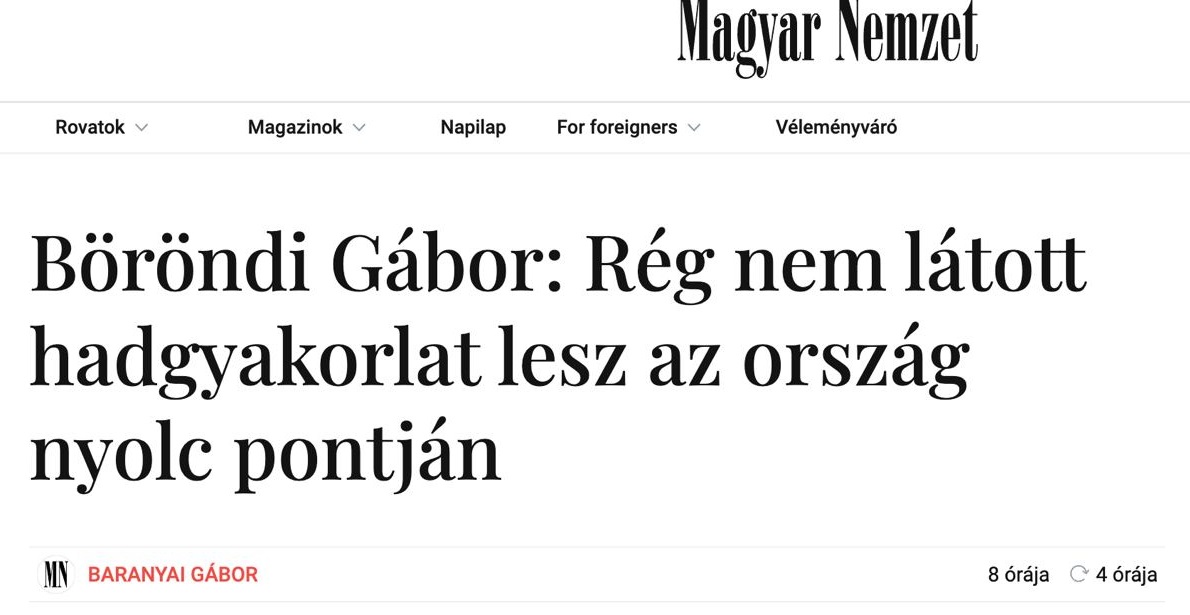 "У листопаді ми проведемо набагато масштабніші навчання, під час яких не тільки здійснимо військові маневри у восьми населених пунктах країни, але й оцінимо можливості співпраці угорських сил оборони та цивільної адміністрації", – сказав Беренди.