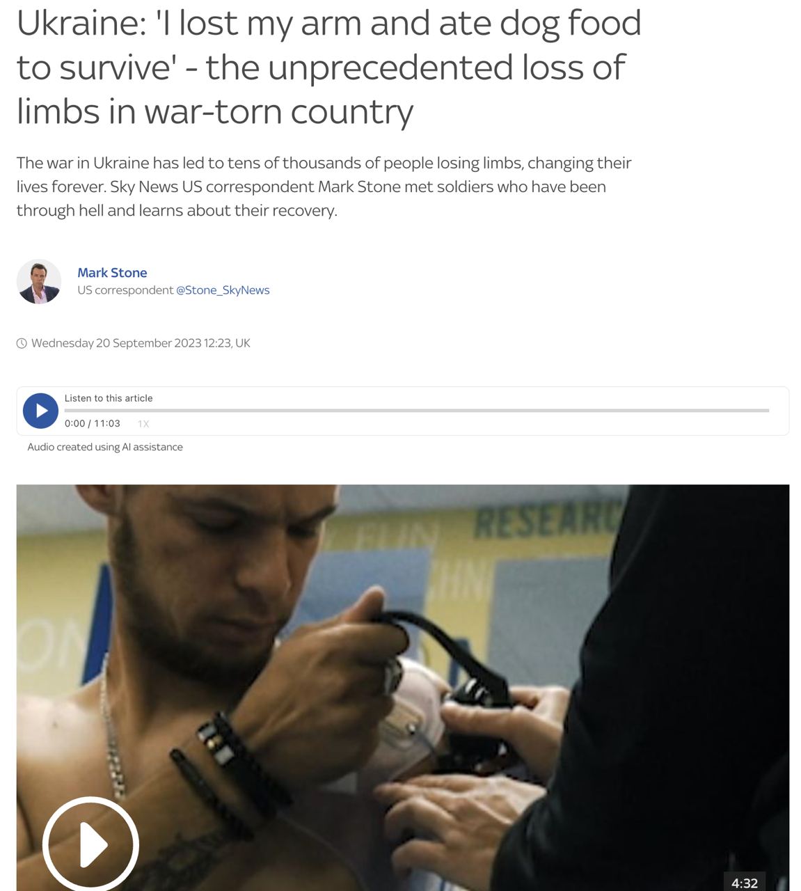 Sky News зазначає, що за 18 місяців війни в Україні як мінімум у 10 разів більше солдатів зазнали ампутації кінцівок, ніж за 20 років війни американців в Іраку та Афганістані.