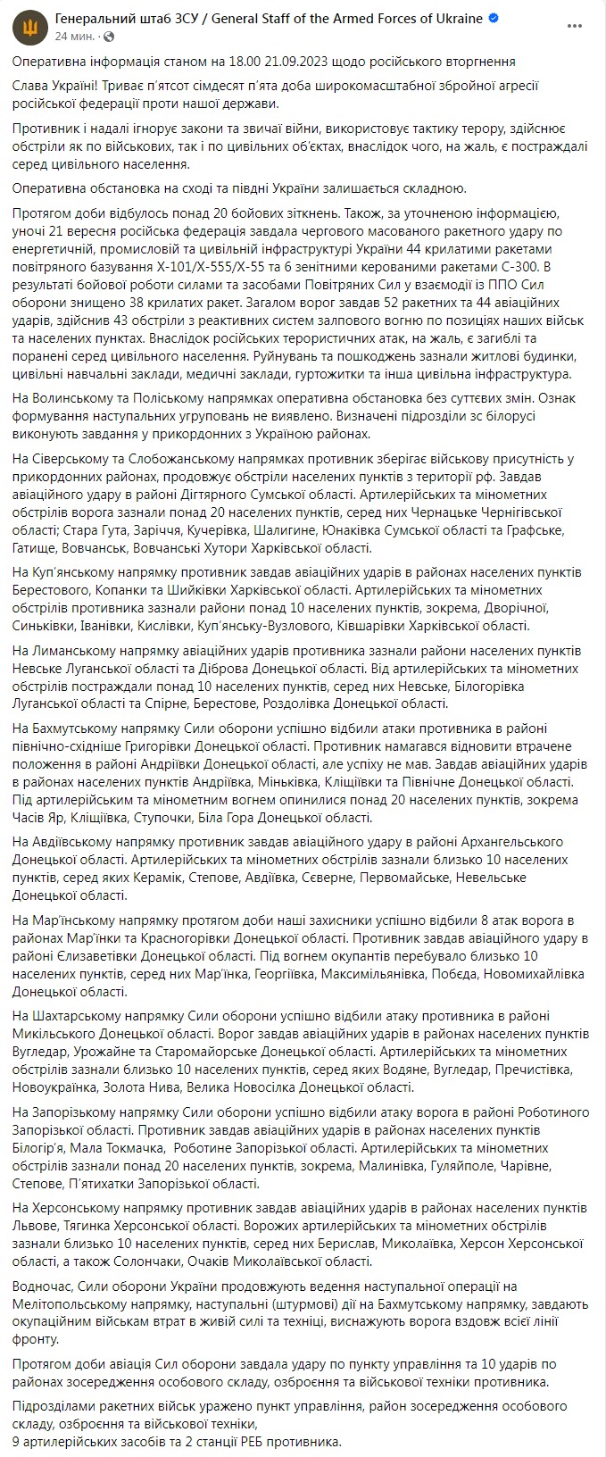 Генеральний штаб ЗСУ опублікував оперативну інформацію щодо ситуації на фронті станом на 18:00 21 вересня.