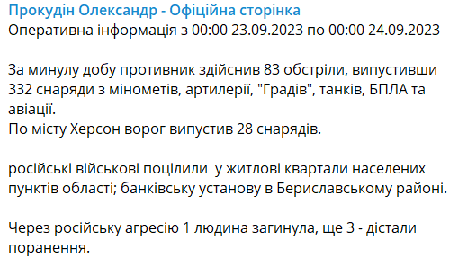 09:07 Минулої доби війська РФ здійснили 83 обстріли, випустивши 332 снаряди з мінометів, артилерії, "Градів", танків, БПЛА та авіації. Містом Херсон ворог випустив 28 снарядів.