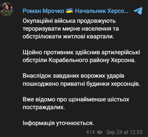 "Щойно противник здійснив артилерійські обстріли Корабельного району Херсона. Внаслідок завданих ворожих ударів пошкоджено приватні будинки херсонців", - написав Мрочко.