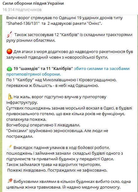 19 "шахедів" та 11 "Калібрів" збиті силами та засобами ППО. По одному "Калібру" над Миколаївською та Кіровоградською областю, переважна більшість – у небі над Одеською.