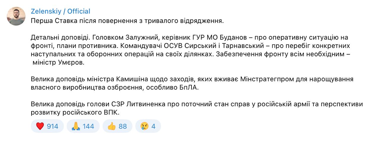 14:25 Зеленський повідомляє, що провів першу Ставку після повернення з Північної Америки.