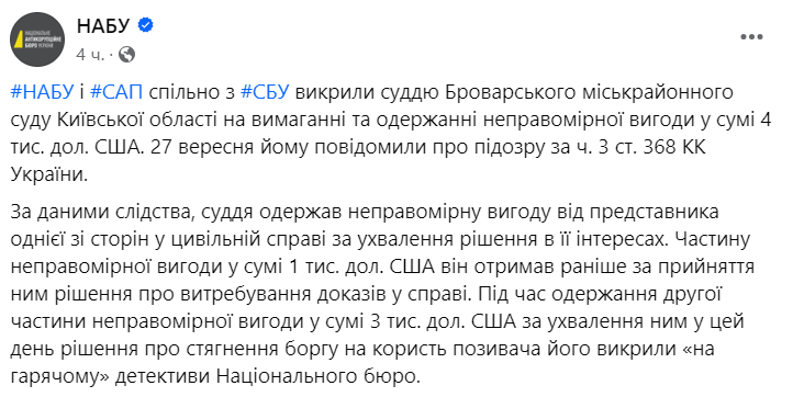 За даними слідства, суддя отримав неправомірний зиск у сумі 4 тисячі доларів від представника однієї зі сторін у цивільній справі за ухвалення рішення на його користь.