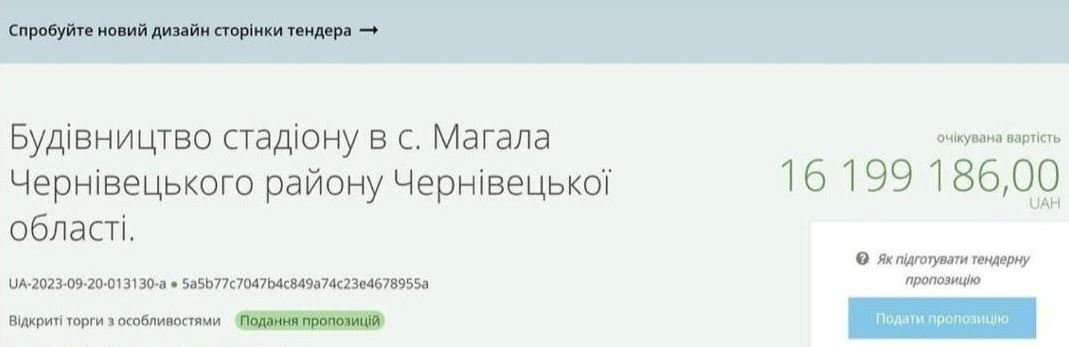 Згідно з цими даними, 16 млн гривень планують витратити місцева влада на стадіон у селі Магала Чернівецької області (30 кілометрів від Румунського кордону). Населення села, згідно з Вікіпедією - 2500 осіб.