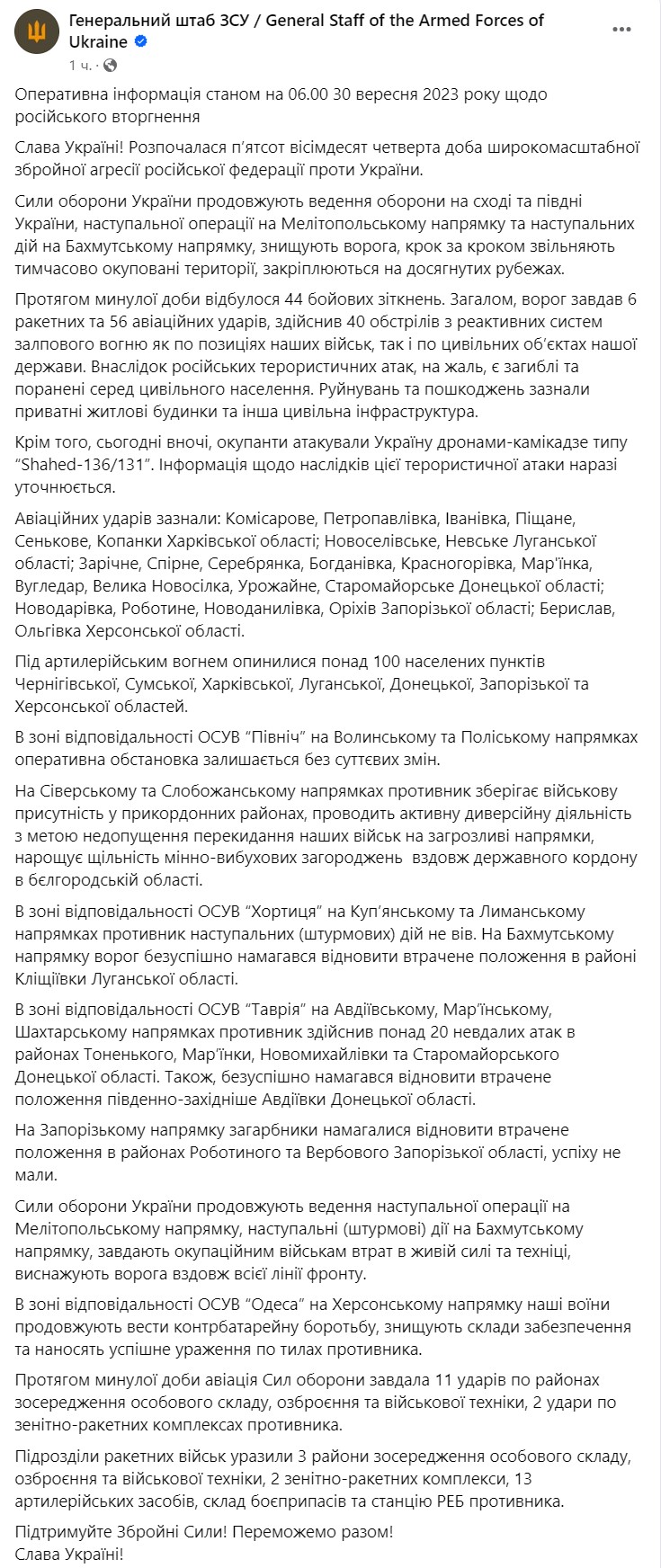 Війна в Україні триває вже 584-й день. Ми стежимо за останніми новинами та ключовими подіями 30 вересня 2023 року в онлайні, що оновлюється.