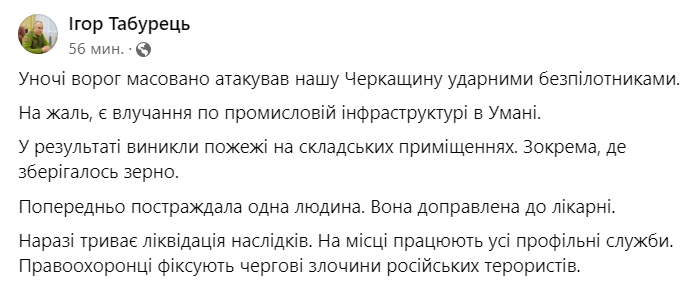 "Вночі ворог масовано атакував нашу Черкащину ударними безпілотниками. На жаль, є попадання промисловою інфраструктурою в Умані. В результаті виникли пожежі на складських приміщеннях. Зокрема, де зберігалося зерно", - написав Табурець.