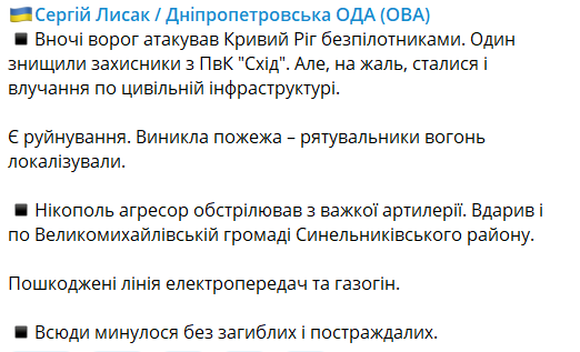 "Вночі ворог атакував Кривий Ріг безпілотниками. Один знищили захисники з ПВК "Схід". Але, на жаль, відбулися і попадання цивільної інфраструктури", - написав Лисак.