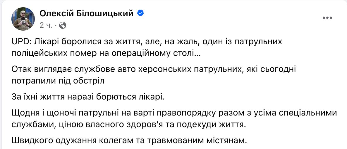 15:42 У Херсоні помер патрульний, поранений під час ранкового обстрілу, повідомив заступник голови Департаменту патрульної поліції Олексій Білошицький.