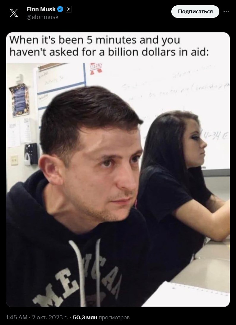 Ілон Маск опублікував сьогодні мем із особою, схожою на Володимира Зеленського та підписом "Коли ти вже п'ять хвилин не просив мільярда доларів допомоги".