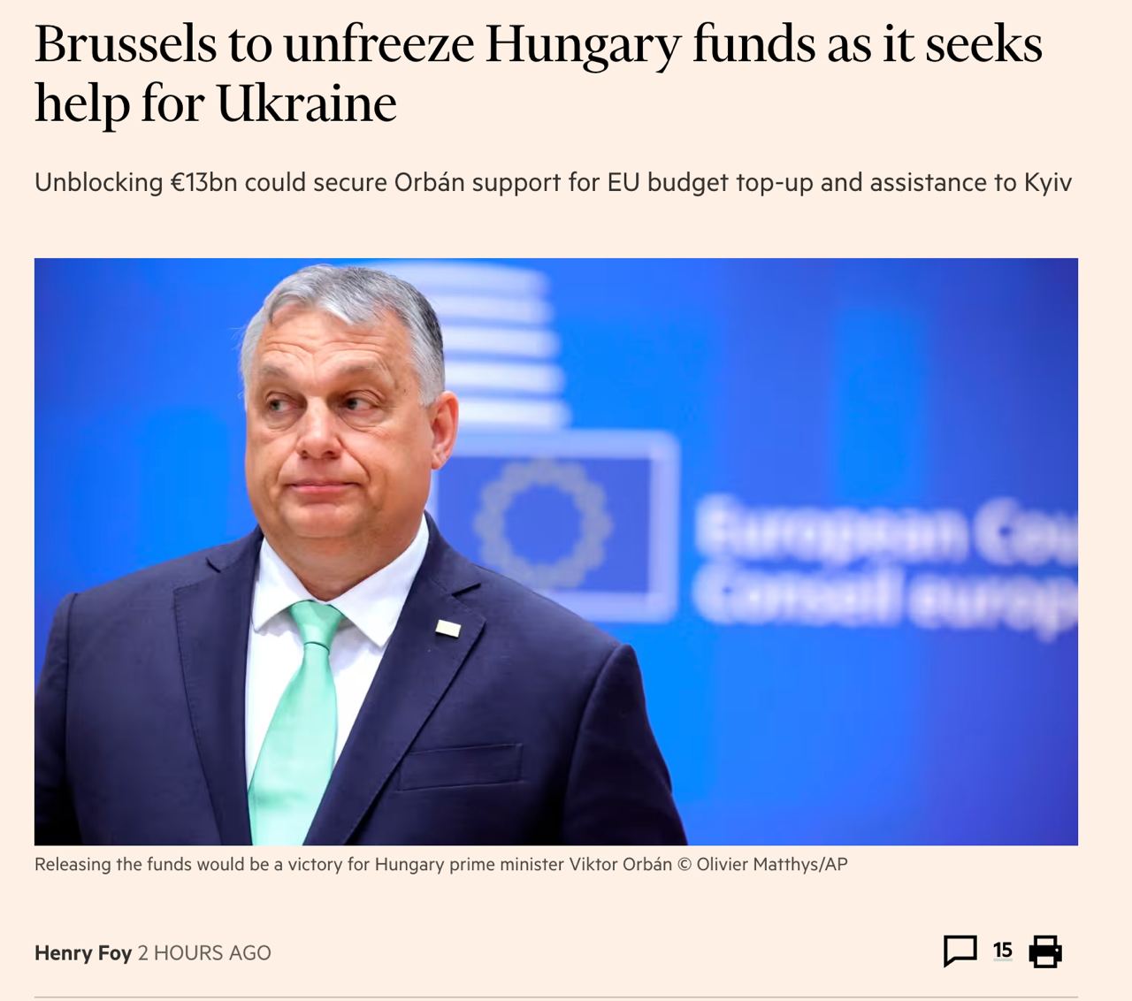 Єврокомісія готова розморозити 13 млрд. євро для Угорщини, щоб отримати підтримку прем'єра Віктора Орбана при виділенні допомоги Україні.