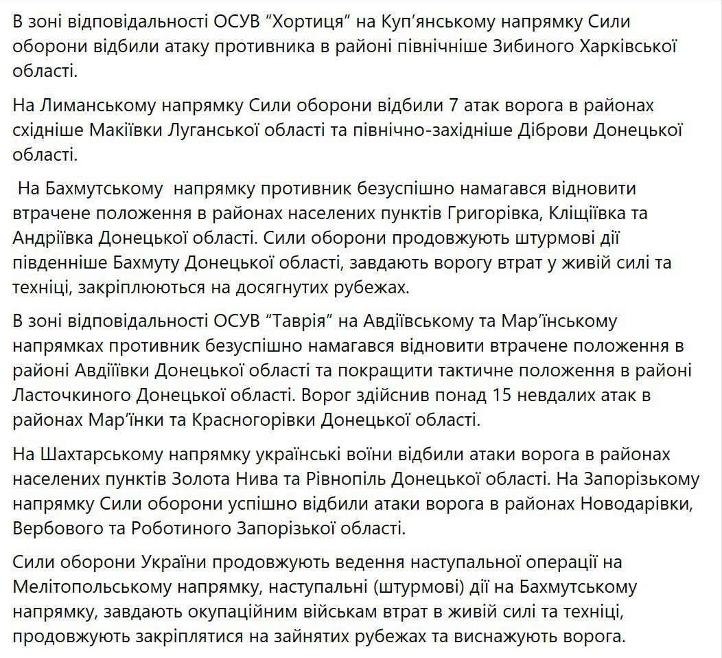 Що ж до ЗСУ, то українські частини "продовжують проведення наступальної операції на Мелітопольському напрямку, наступальні (штурмові) дії на Бахмутському напрямку".