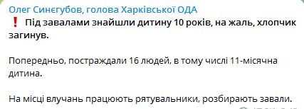 Тіло 10-річну дитину дістали з-під завалів. Ще 16 людей поранено. Двох врятували співробітники ДСНС.