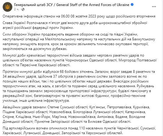 Уранці 8 жовтня Генштаб ЗСУ оприлюднив зведення про ситуацію на фронті.