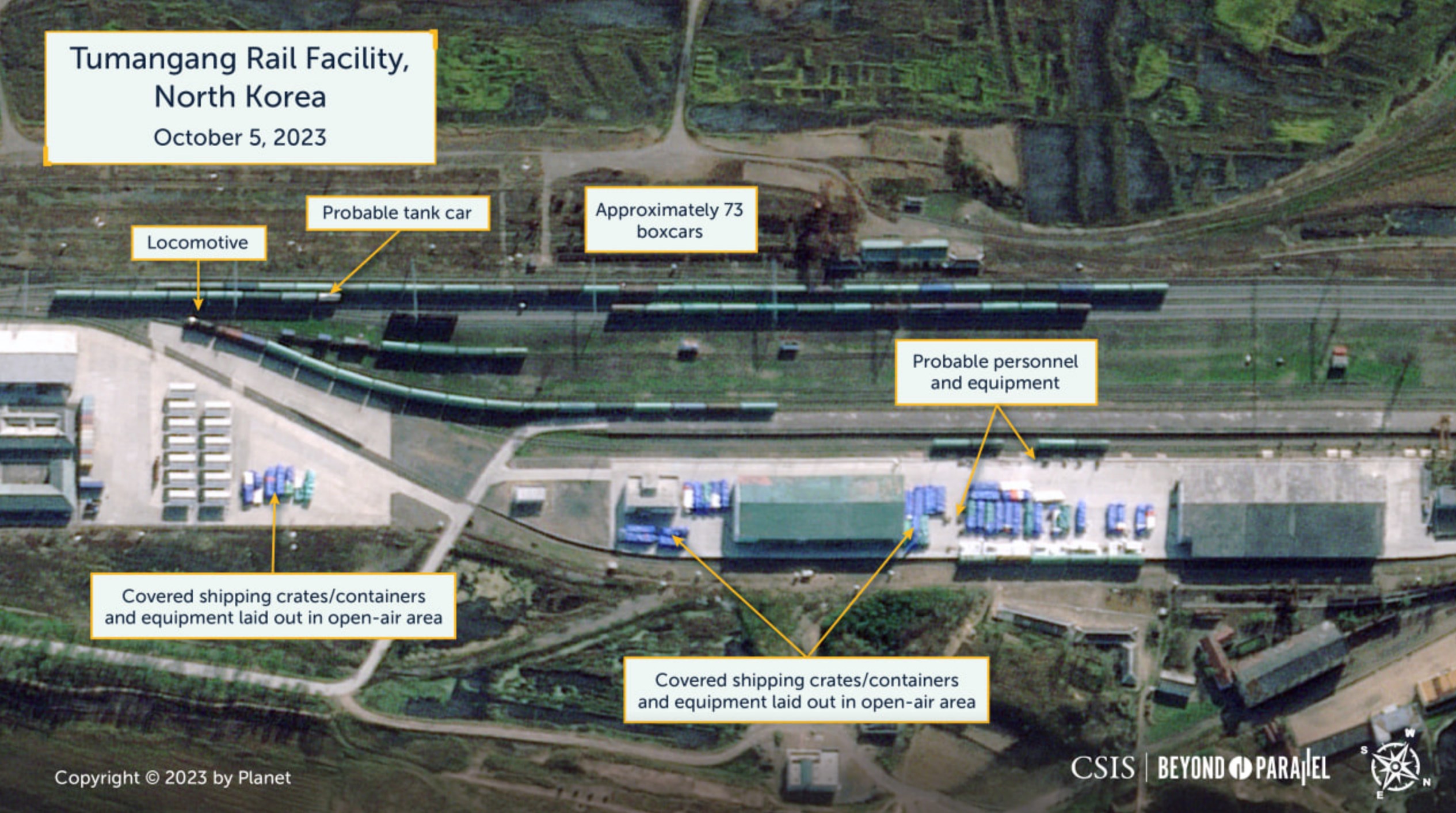 Супутникові знімки залізничного пункту Туманган на кордоні КНДР із РФ показують "безпрецедентну кількість" вантажних вагонів за 5 жовтня - близько 73 вагонів. Цей рівень набагато перевищує той, який Beyond Parallel спостерігав останні п'ять років, навіть до Covid-19.