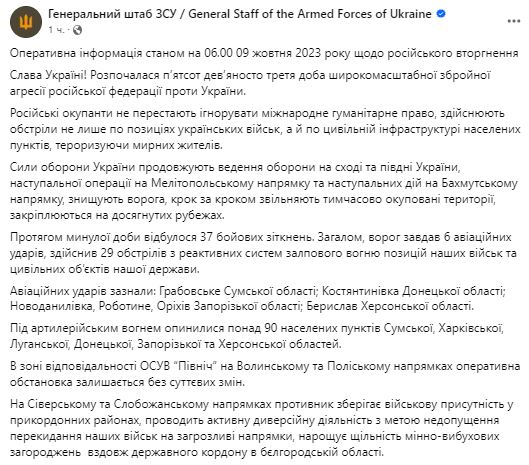 Вранці 9 жовтня Генштаб ЗСУ оприлюднив зведення про ситуацію на фронті.