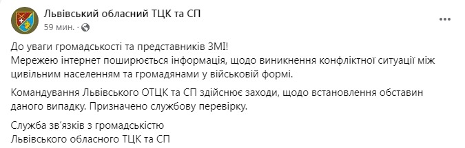 На відео з’явилася реакція Львівського ТЦК. Там повідомляють, що розпочали перевірку щодо інциденту, який потрапив до соцмережі та викликав резонанс.
