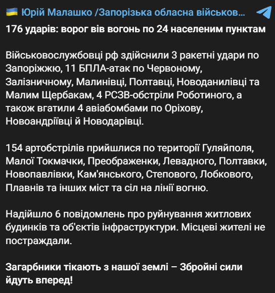 Також росіяни здійснили 11 БПЛА атак по Червоному, Залізничному, Малинівці, Полтавці, Новоданилівці та Малим Щербакам, 4 РСЗВ-обстріли Роботиного, а також скинули 4 авіабомбами по Оріхову, Новоандріївці та Новодарівці.