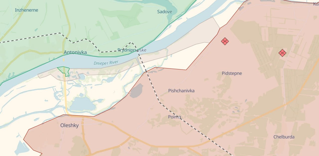 Заявлялося, що вчора ЗСУ форсували Дніпро в районі Антонівського залізничного мосту (він на схід від автомобільного) і висадилися на лівому березі біля сіл Пойма та Піщанівка. Це ділянка на схід від Олешок біля дороги у бік Нової Каховки. Повідомлялося, що українські частини опанували частину Піщанівки.