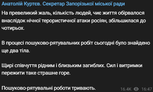 У Запоріжжі вже четверо загиблих внаслідок нічного ракетного удару по житловому будинку. Під завалами знайшли ще два тіла.