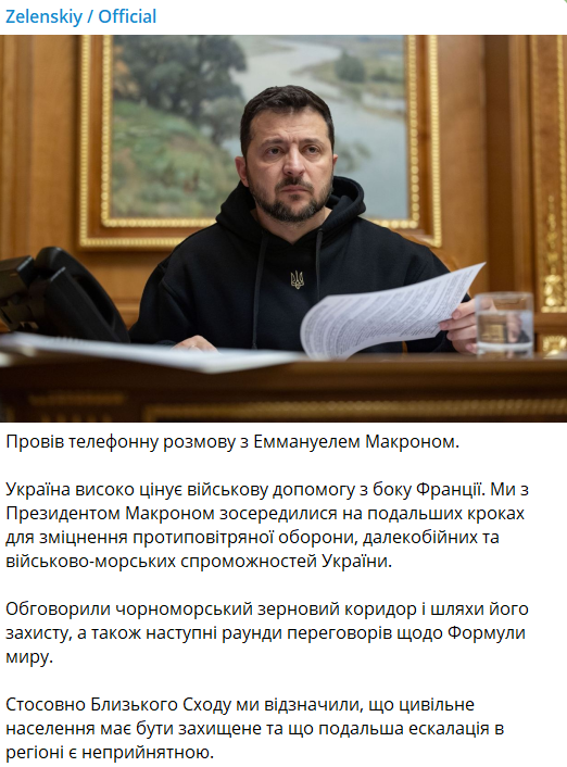 "Ми з президентом Макроном зосередилися на подальших кроках щодо зміцнення протиповітряної оборони, далекобійних та військово-морських здібностей України", - написав Зеленський.