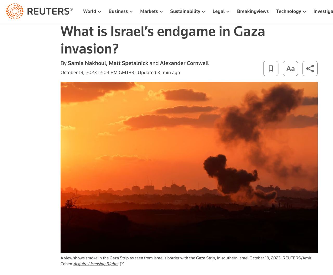 Ізраїльські чиновники анонімно заявили, що вони не мають чіткого уявлення про те, як може виглядати повоєнне майбутнє Гази. США стурбовані відсутністю цього плану. Післявоєнний план для сектору Газа обговорювався, крім інших тем, під час візитів до Ізраїлю держсекретаря Ентоні Блінкена та міністра оборони Ллойда Остіна минулого тижня.