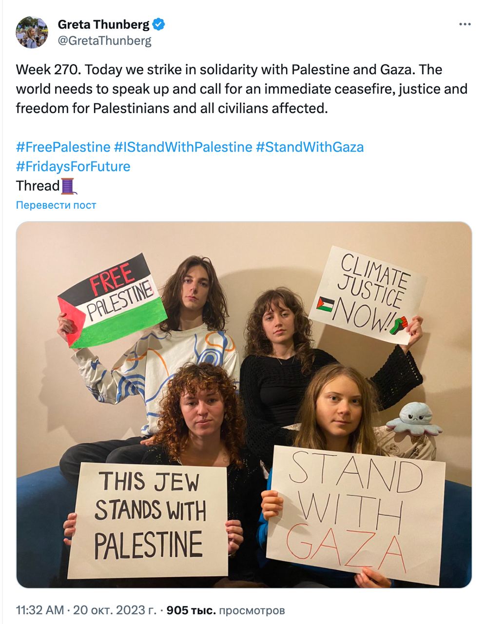 "Сьогодні ми страйкуємо на знак солідарності з Палестиною та сектором Гази. Світу необхідно висловитися та закликати до негайного припинення вогню, справедливості та свободи для палестинців та всіх постраждалих цивільних осіб", - підписала Тунберг фото, на якому вона та група молодих людей тримають плакати у підтримку Гази.