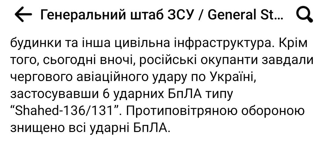 07.41 По Україні сьогодні вночі було випущено шістьох безпілотників "Шахид", повідомляє Генштаб ЗСУ.
