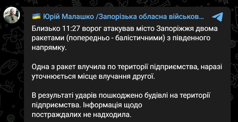 12.20 У Запоріжжі підтвердили ракетний удар по місту.