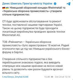 "Створення спільного підприємства без перебільшення є знаковою подією, яка виводить співпрацю між нашими країнами на якісно новий рівень і дозволить нам разом будувати арсенал вільного світу", - наголосив Шмигаль.
