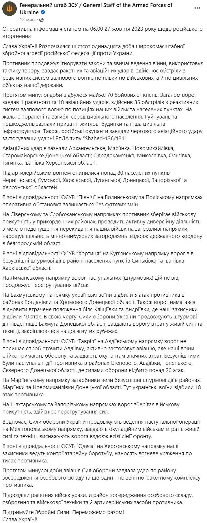 Минулої доби сталося майже 70 бойових зіткнень. Всього росіяни завдали 1 ракетного та 18 авіаційних ударів, здійснили 35 обстрілів з реактивних систем залпового вогню за позиціями наших військ та населеними пунктами.
