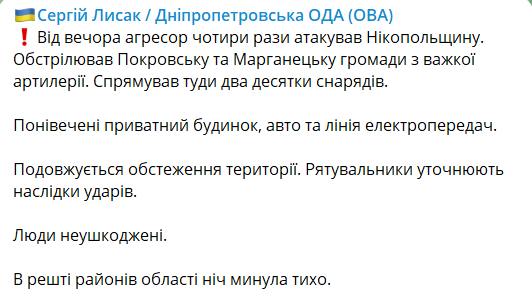 "З вечора агресор чотири рази атакував Нікопольщину. Обстрілював Покровську та Марганецьку громади з важкої артилерії. Направив туди два десятки снарядів", - написав Лисак.