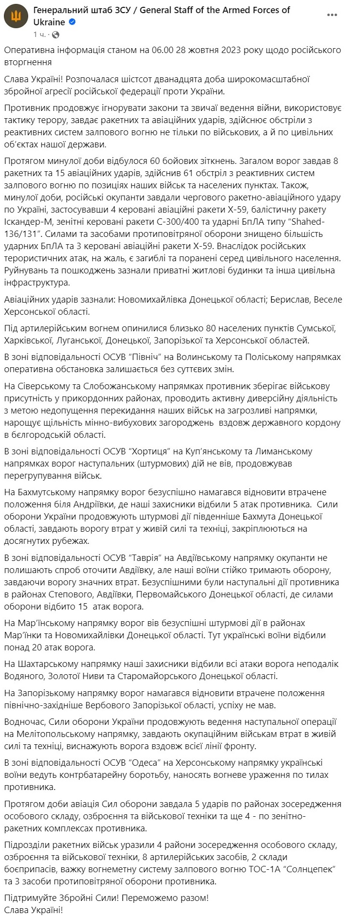Війна в Україні триває вже 612-й день. Ми стежимо за останніми новинами та ключовими подіями 28 жовтня 2023 року в онлайні, що оновлюється.