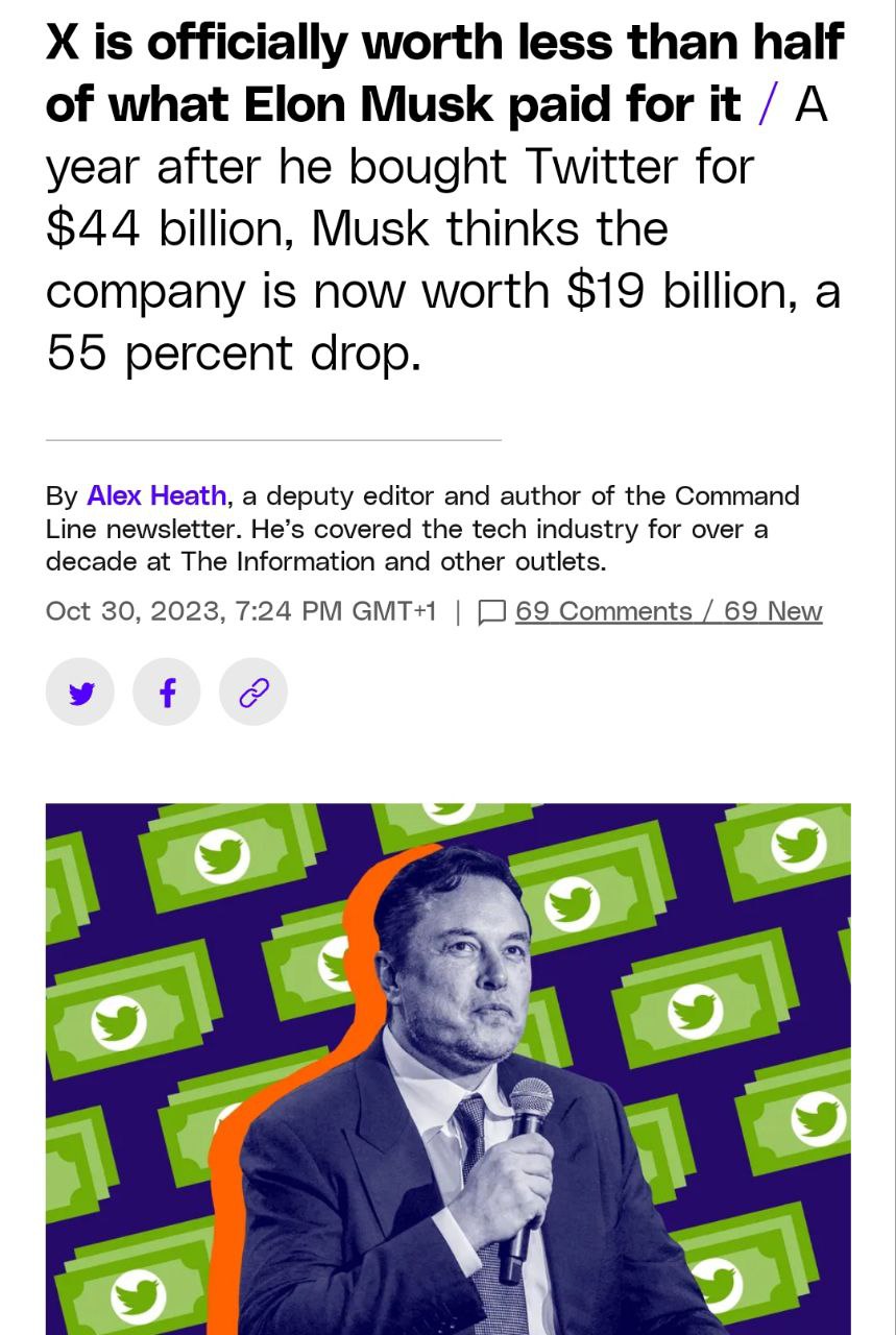 Якщо Маск викупив Твіттер за 44 мільярди доларів, то зараз вартість Х оцінюється у 19 млрд (або 45 доларів за акцію).
