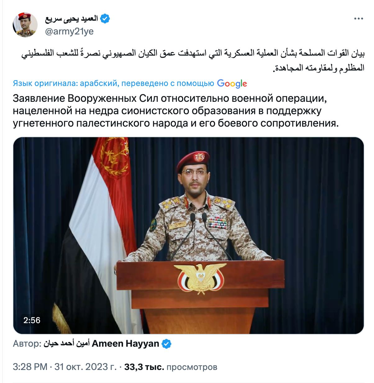 "Заява Збройних сил щодо військової операції, націленої на надра сіоністської освіти на підтримку пригнобленого палестинського народу та його бойового опору", - підписано ролик генерала у Х.