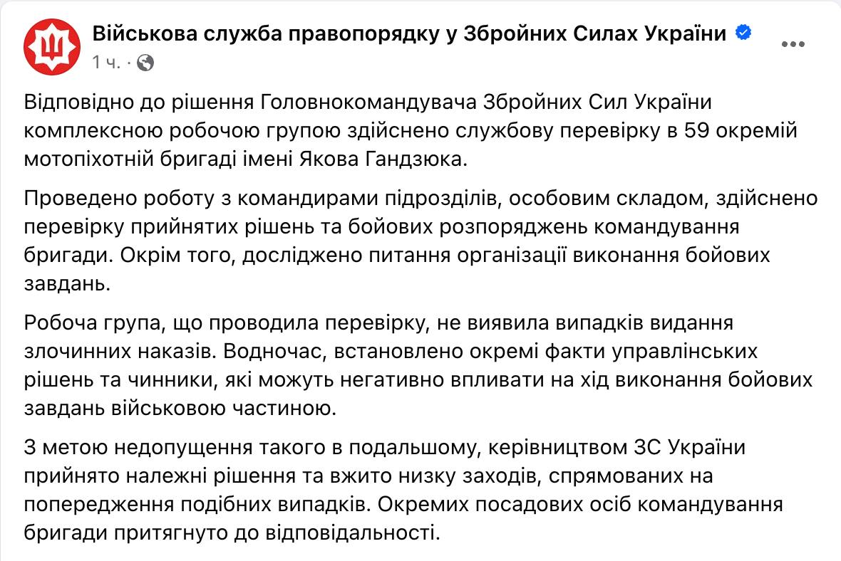 "Водночас встановлено окремі факти управлінських рішень та фактори, які можуть негативно впливати на хід виконання бойових завдань військовою частиною. З метою недопущення такого надалі керівництвом ЗС України вжито належних рішень та вжито низку заходів, спрямованих на запобігання подібним випадкам. Окремі посадові осіб командування бригади притягнуто до відповідальності", - йдеться у повідомленні.