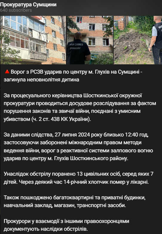 Сьогодні вдень російські війська вдарили по центру Глухова Сумської області із РСЗВ. Поранено 13 осіб, серед яких 7 дітей. 14-річний хлопчик помер у лікарні.