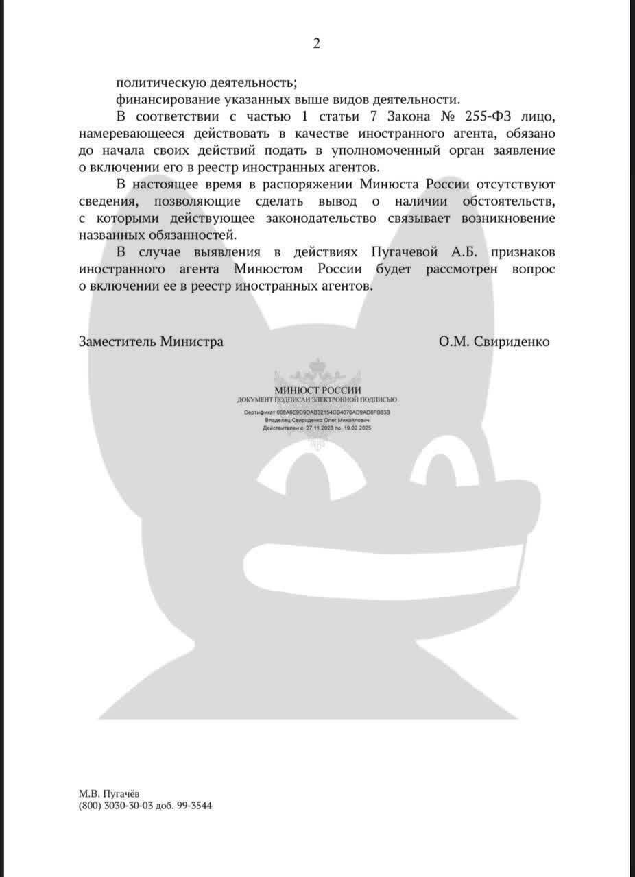 У відповіді на запит у Мін'юсті повідомили, що не мають відомостей, щоби зробити висновок про наявність обставин для визнання Пугачовою іноагентом.
