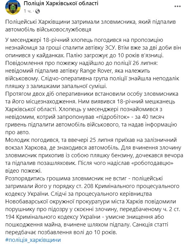 "Протягом доби оперативники встановили особу зловмисника та його місцезнаходження. Ним виявився 18-річний мешканець Харківської області. Хлопець у месенджері познайомився з невідомим, який запропонував "підробіток" - за 40 тисяч гривень підпалити автомобіль військового та надав інформацію про автомобіль", - йдеться у повідомленні. у повідомленні.
