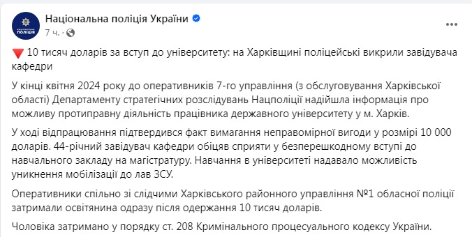 Наприкінці квітня 2024 року оперативникам 7-го управління Департаменту стратегічних розслідувань Нацполіції надійшла інформація про можливу протиправну діяльність співробітника державного університету у Харкові. Під час відпрацювання підтвердився факт здирництва неправомірної вигоди у розмірі 10 000 доларів.