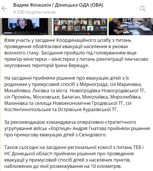 Також на засіданні регіональної комісії з ТЕБ та НС ухвалено рішення про примусову евакуацію дітей із населених пунктів, наближених до лінії розмежування на 10 кілометрів. Серед них населені пункти Селидівської, Курахівської та Іллінівської громад.