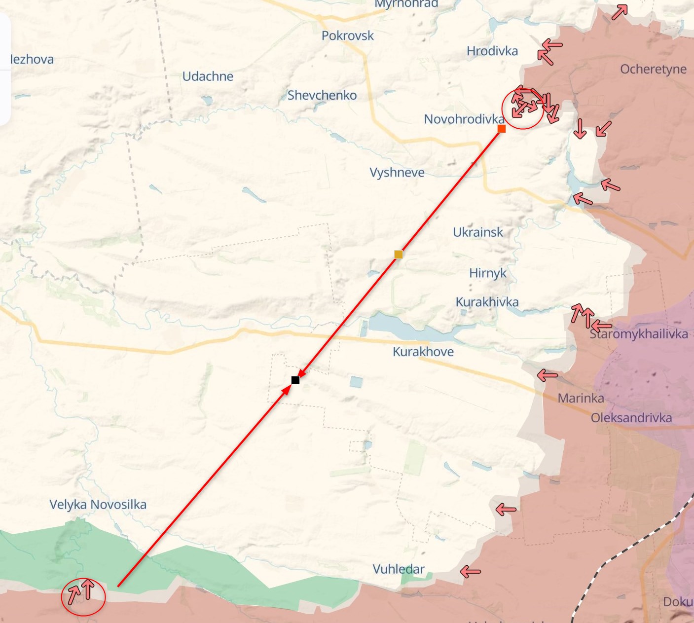Велике питання, чи є на захід від цих міст облаштовані лінії укріплень та мінні поля. Зважаючи на те, що від Очеретино, Прогресу і далі російський наступ демонструє найвищі темпи з усіх ділянок фронту, зі зміцненнями тут проблема. Для порівняння: біля Карлівського водосховища ЗСУ тримають фронт уже довгий час, а у напрямку Курахового від Мар'їнки армія РФ просувається дуже повільно.