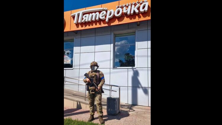 З'явилося фото українського військового біля магазину російської мережі "П'ятірочка" у Суджі Курської області