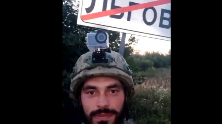 Українські телеграм-канали публікують відео з українським військовим, який стоїть біля таблички з написом "Льгов". Це назва міста, розташованого за 15 кілометрів від Курської АЕС.