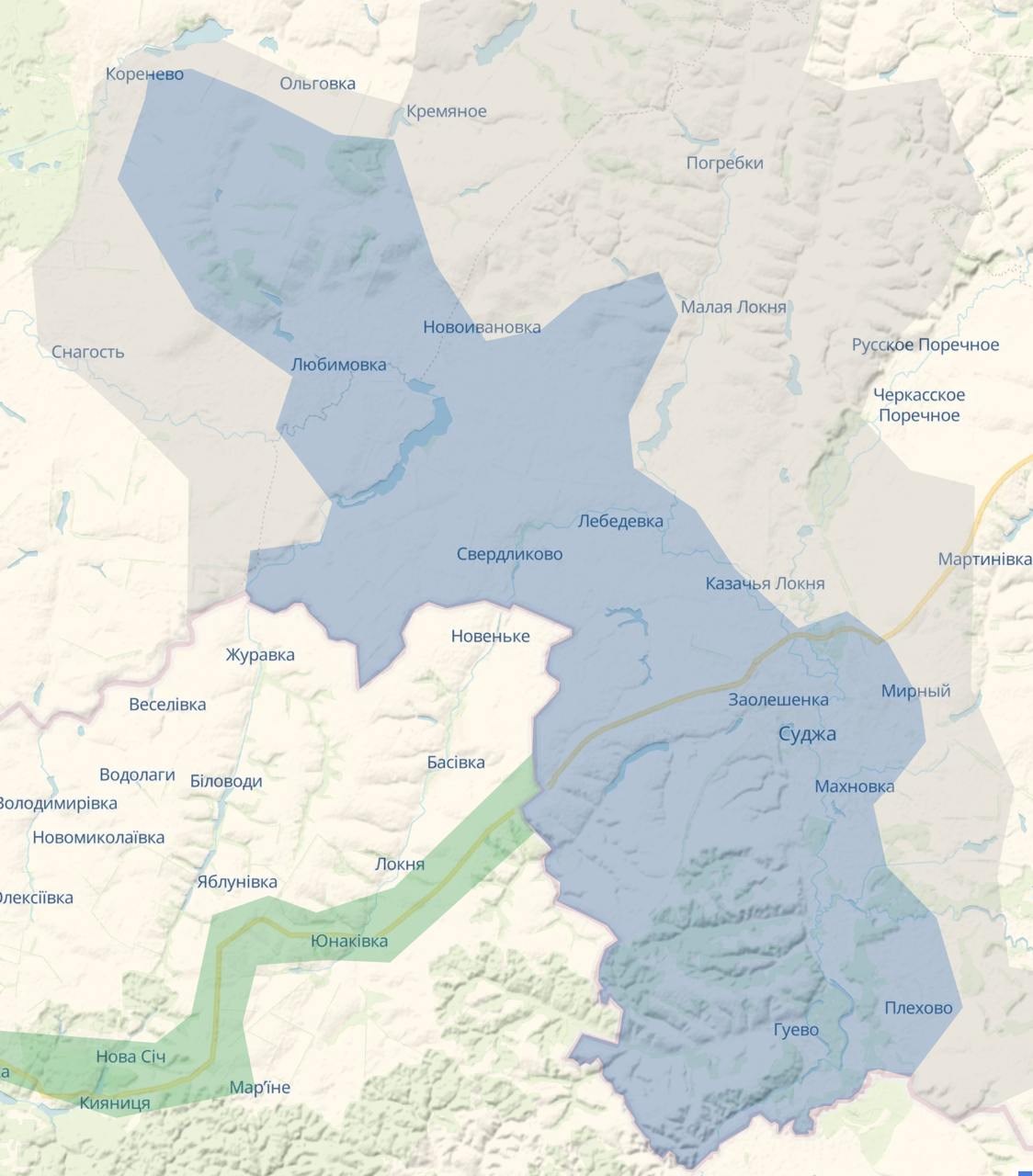 Deep State повідомив, що українські війська взяли Любимівку, Гончарівку, Лебедівку, Заолешенку, Курилівку, Плехово та інші населені пункти (не уточнюючи, коли саме). Загальна площа захоплених ЗСУ територій РФ, за даними паблік, - 469 кв. км. Ще 506 знаходяться у сірій зоні. За даними Сирського, площа підконтрольних Україні територій Курської області вдвічі більша - 1000 квадратних кілометрів (площа всієї Курської області - 29 тисяч квадратних кілометрів).