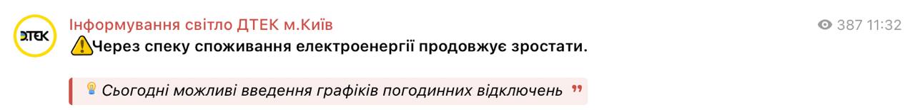 11:48 Відключення світла сьогодні можливе, хоча й не було заплановано, повідомляє київський ДТЕК.