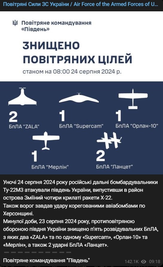 Минулої доби, 23 серпня 2024 року, протиповітряною обороною півдня України знищено п'ять розвідувальних БПЛА, з яких два "ZALA" та по одному "Supercam", "Орлан-10" та "Мерлін", а також 2 ударні БПЛА "Ланцет".