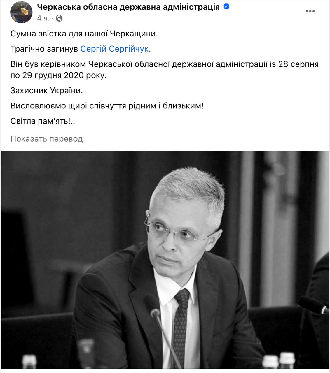 "Трагічно загинув Сергій Сергійчук. Був головою Черкаської ОДА з 28 серпня до 29 грудня 2020 року.