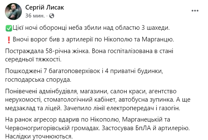 "На ранок агресор вдарив по Нікополю, Марганецькій та Червоногригорівській громадам. Застосував БПЛА та артилерію. Наслідки уточнюються", - додав Лисак.